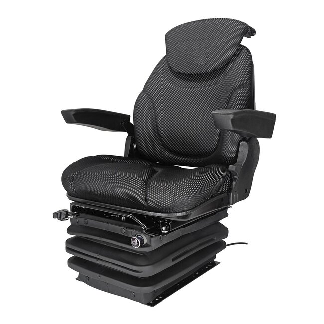 Dieser luftgefederte Traktorsitz ist als komfortabler Arbeitssitz mit Stoffbezug und breiter Luftfederung ausgeführt. Der Sitz verfügt über einen integrierten 12V/24V-Luftkompressor und einen Federweg von 100 mm in Kombination mit einem hydraulischen Stoßdämpfer. Die Gewichtseinstellung ist manuell von 50 bis 130 kg einstellbar. Die Sitzhöhe ist stufenlos über 80 mm verstellbar und die Rückenlehne lässt sich um 30° nach hinten und 85° nach vorne verstellen. Zudem ist der Sitz mit einer horizontalen Dämpfung in Längsrichtung und einer mechanischen Lordosenstütze ausgestattet. Die Armlehnen sind höhenverstellbar und klappbar. Dieser luftgefederte Komfortsitz erfüllt die geltenden EU-Normen.
