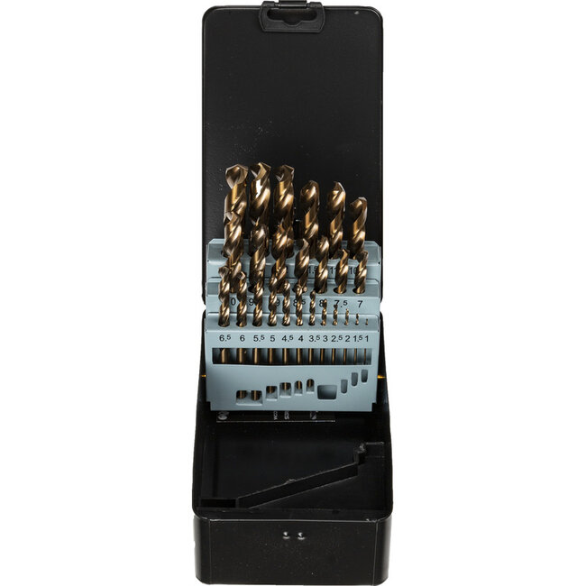 This 25-piece HSS cobalt drill bit set is fully ground for high accuracy and long tool life. With 5% cobalt content, these bits offer excellent heat resistance and are ideal for working on tough materials. Designed for professional metalworking.