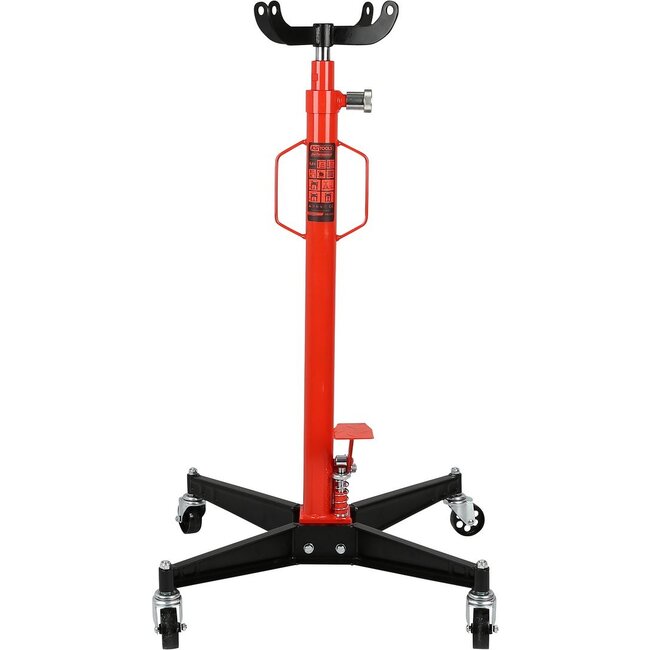 Ideal for safe installation and removal. Uncomplicated lifting with hydraulic foot pump. Continuous adjustment allows for precise positioning. Especially wide working area. Transmission holder attached to the piston rod. Includes transmission holder. With