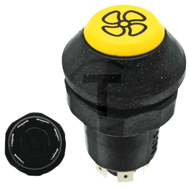 Caractéristiques: 12 / 24 V, bouton jaune, avec arrêt,, Ø 30 mm, 6 connexions à fiches plates 6,3 x 0,8 (L- 49a- R- 30b- 15- 49), protection contre la poussière et les éclaboussures, avec lampe à culot en verre 12 V / 1,2 W.