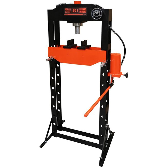 Presse d’atelier particulièrement robuste. Convient au pressage, à l’alignement et au pliage. Manomètre inclus pour indiquer la force de pression. Large surface d’appui pour un maintien sûr. Vérin hydraulique robuste. Plateau réglable en hauteur. L’assist