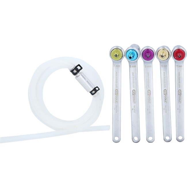 Ideaal voor moeilijk bereikbare plaatsen tijdens het remmen ontluchten. Voor remontluchting zonder de-montage wielen. Siliconen ontluchtingsslang (120 cm) blijft bij het los- en vastdraaien op de ontluchtingsnippel. Met terugslagklep, die het terugstromen